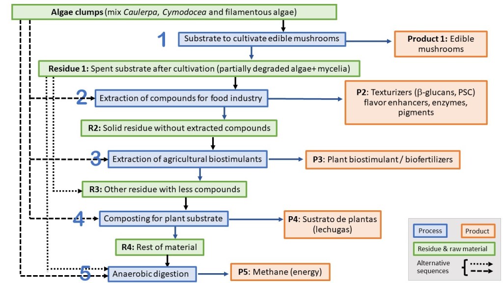 The algae accumulated on Mar Menor shore will be tested as a substrate to cultivate edible mushrooms (1). The algal wracks, before and after the fungal growth, will be submitted to extractions to obtain compounds with food applications (additives, supplements, flavorings, etc.) using environmentally friendly technologies (2). The extracts obtained from the waste derived from the algae and after the mushroom cultivation, will be tested as biostimulants and biofertilizers for plants and organic amendments for contaminated soils (3). The potential of the residue as a plant substrate will also be investigated in greenhouses using lettuce as a model (4). Finally, tests will be carried out to study the potential of all these wastes as raw materials for fermentation in anaerobic digestors to produce methane and to calculate its energy efficiency (5).